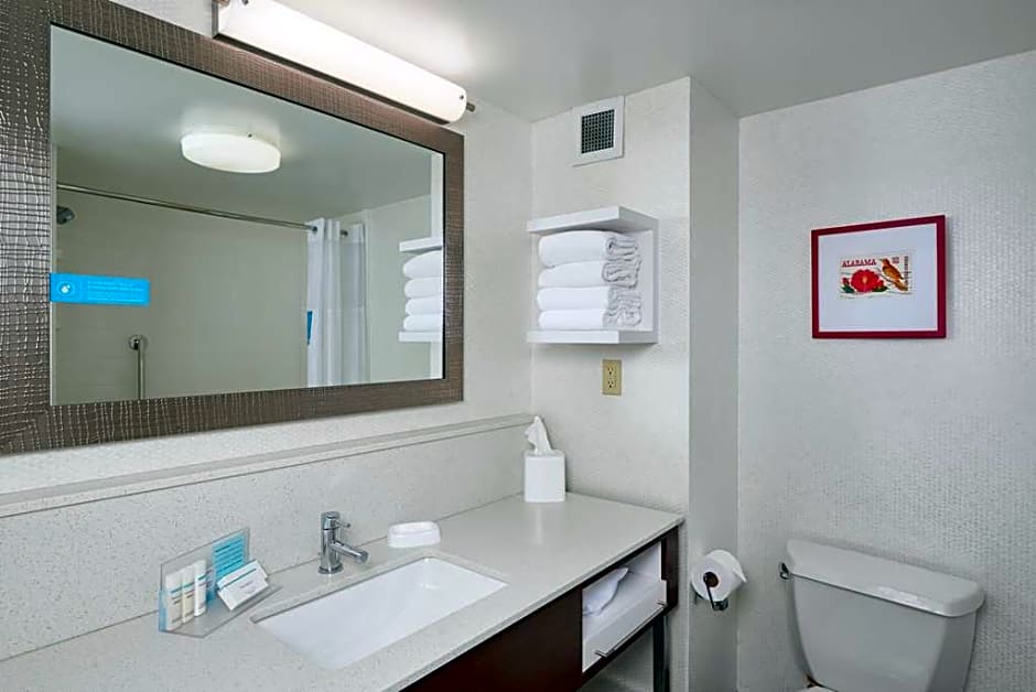 Any corresponding photo may not reflect the specific accessible room type or room feature. This mobility accessible, non-smoking room features one king sized bed featuring our luxurious clean and fresh Hampton bed. The bath is equipped with accessible bath tub. The room features comfortable soft seating, microwave, refrigerator, a HDTV, and easy to operate alarm clock radio. The free high speed internet access will help you stay connected while on the road. If you prefer not to work at the desk, you can use the convenient lap desk instead. You'll also enjoy the convenience of having a coffee maker with tea service and iron-ironing board in your room.